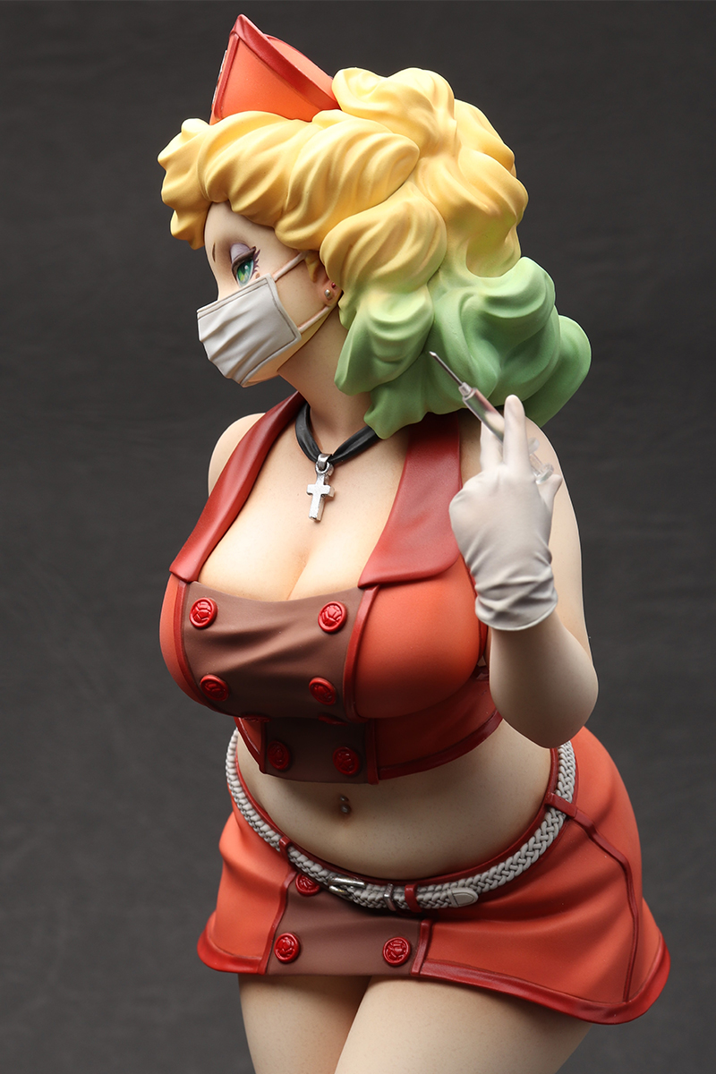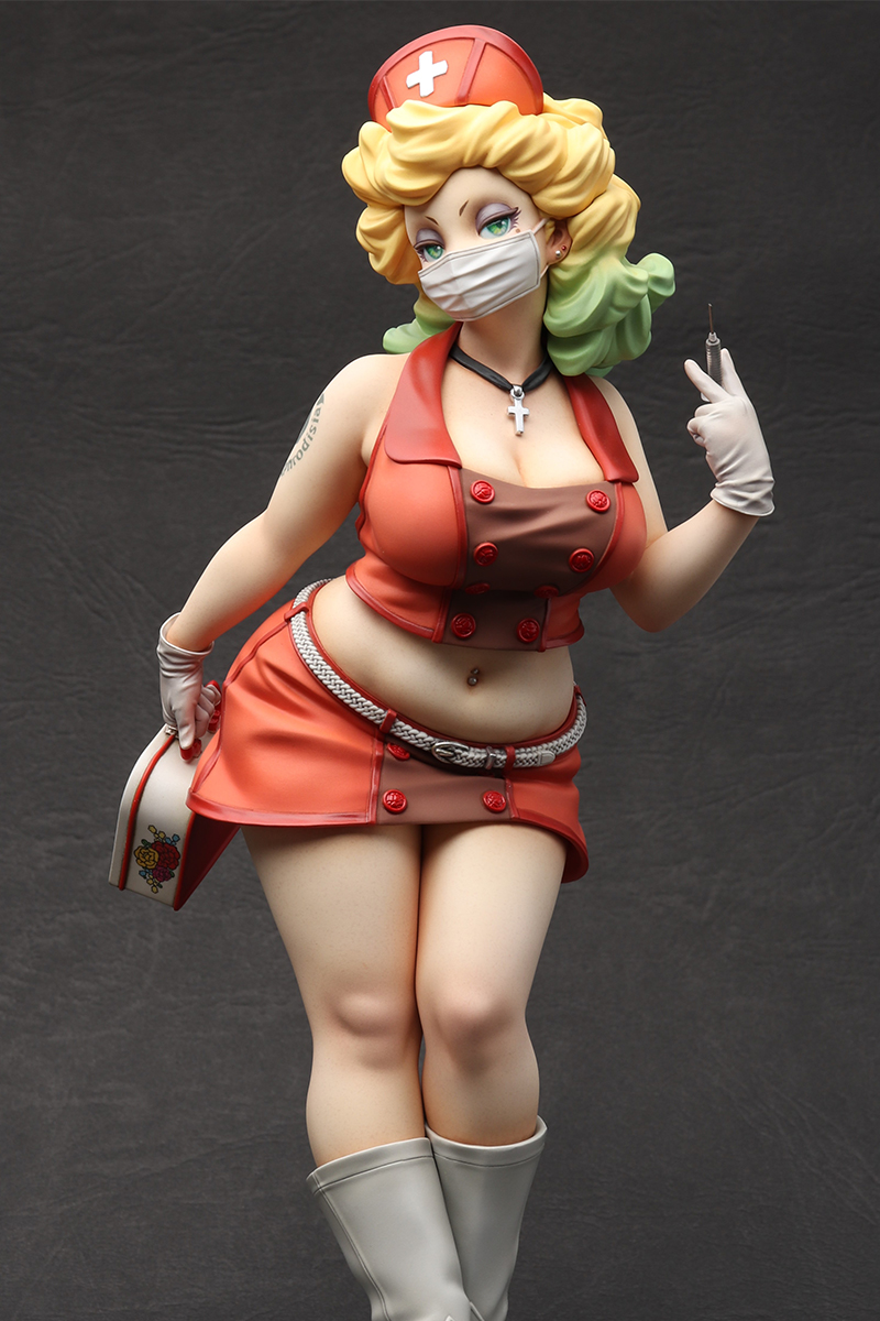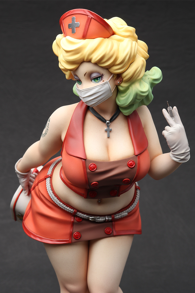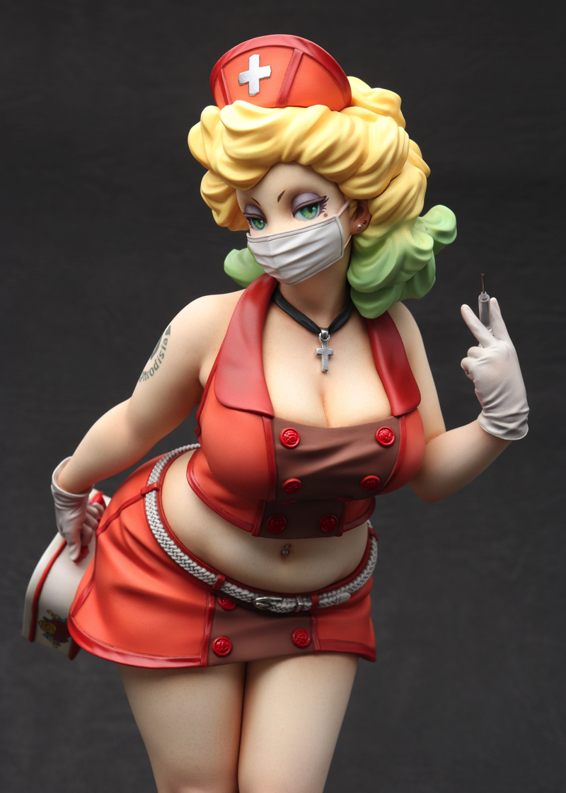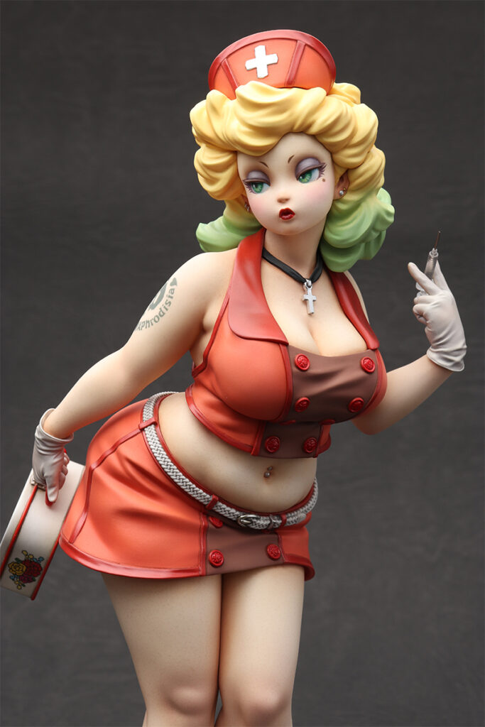 「Playful Nurse」 2022 ケイティ・ムーンの第3弾。 フェイスはマスク有りと無しのコンバーチブル仕様。レトロなランチボックスの花柄はイラストレーターのまつむらあさみさんに依頼。右腕のタトゥーと共にデカールで再現しました。 ZBrushで造形、Form2で出力 原型をレジンキャストで複製後、ラッカー・エナメル塗料で彩色 全高約 230mm