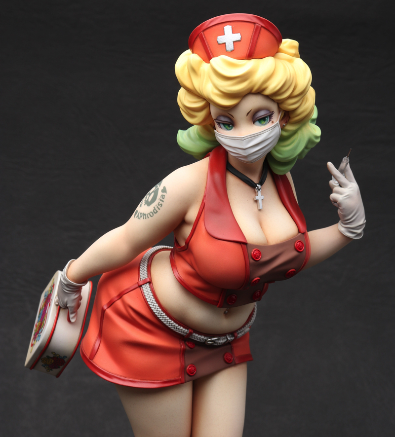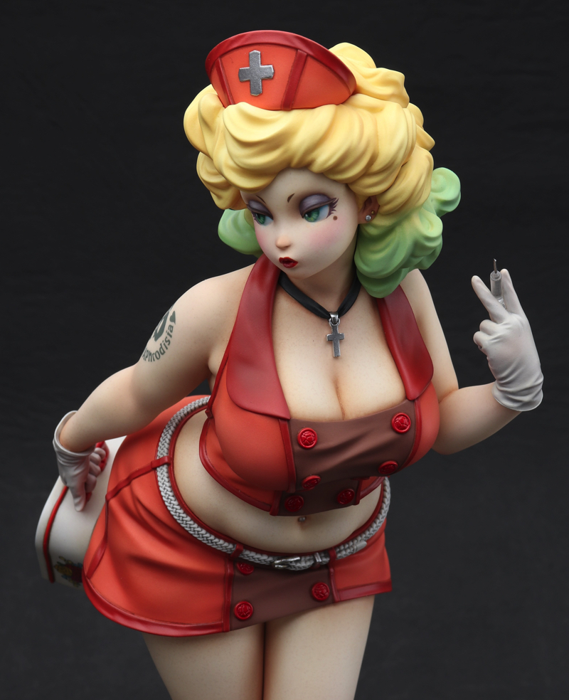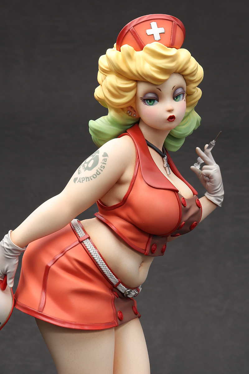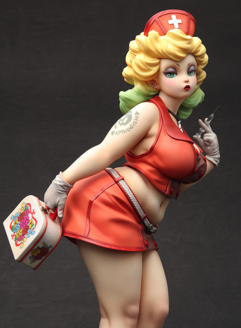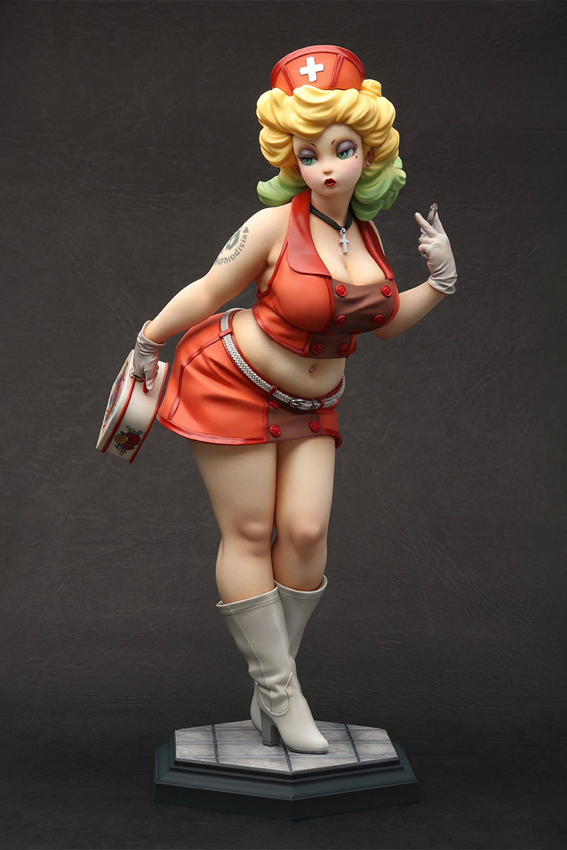 「Playful Nurse」 2022 ケイティ・ムーンの第3弾。 フェイスはマスク有りと無しのコンバーチブル仕様。レトロなランチボックスの花柄はイラストレーターのまつむらあさみさんに依頼。右腕のタトゥーと共にデカールで再現しました。 ZBrushで造形、Form2で出力 原型をレジンキャストで複製後、ラッカー・エナメル塗料で彩色 全高約 230mm